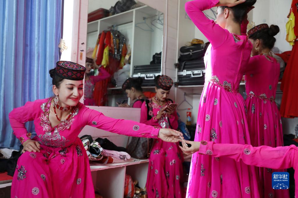 在新疆塔什庫爾干塔吉克自治縣帕米爾旅游區游客服務中心,縣文工團演員在演出前做準備(9月4日攝)。