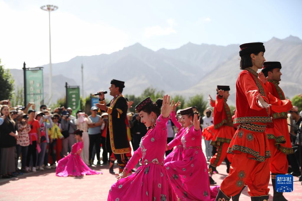 在新疆塔什庫爾干塔吉克自治縣帕米爾旅游區游客服務中心,縣文工團演員唱歌跳舞歡迎游客(9月4日攝)。