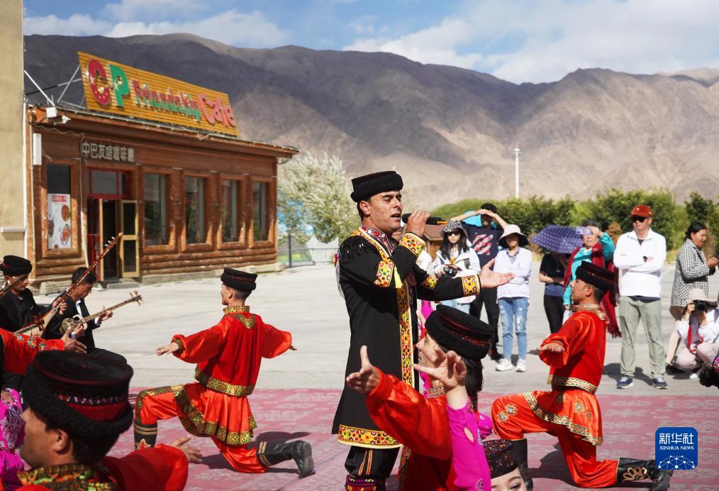 在新疆塔什庫爾干塔吉克自治縣帕米爾旅游區(qū)游客服務(wù)中心,縣文工團(tuán)演員唱歌跳舞歡迎游客(9月4日攝)。