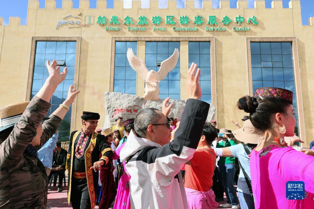 在新疆塔什庫爾干塔吉克自治縣帕米爾旅游區游客服務中心,縣文工團演員與游客共舞(9月4日攝)。