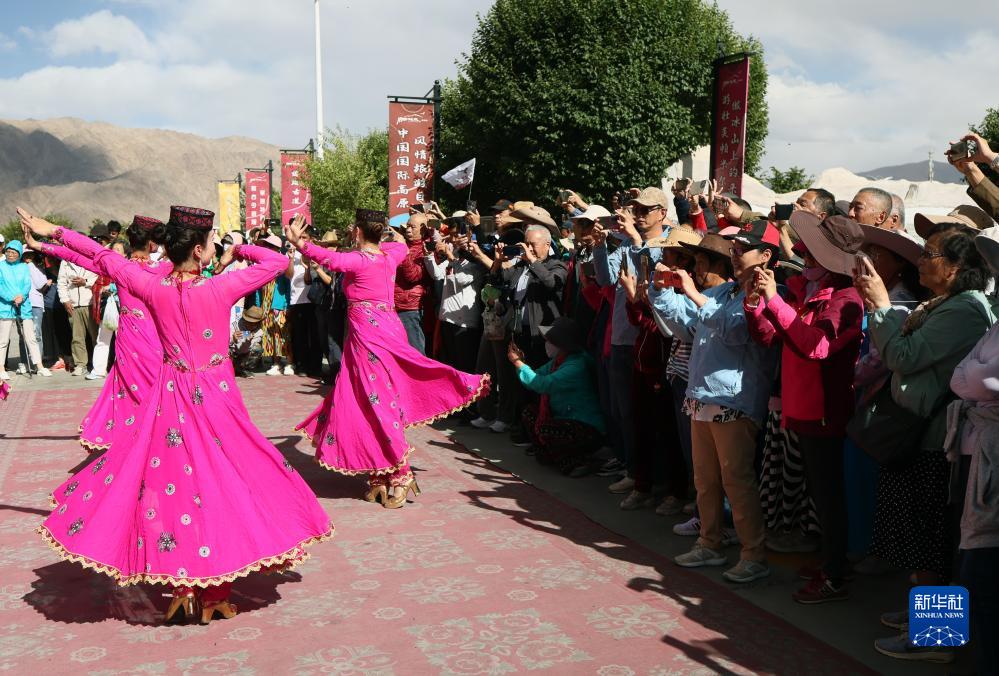 在新疆塔什庫爾干塔吉克自治縣帕米爾旅游區游客服務中心,縣文工團演員跳舞歡迎游客(9月4日攝)。