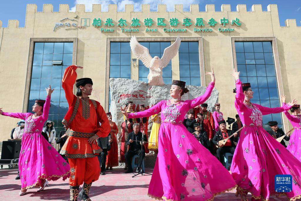 在新疆塔什庫爾干塔吉克自治縣帕米爾旅游區游客服務中心,縣文工團演員跳舞歡迎游客(9月4日攝)。