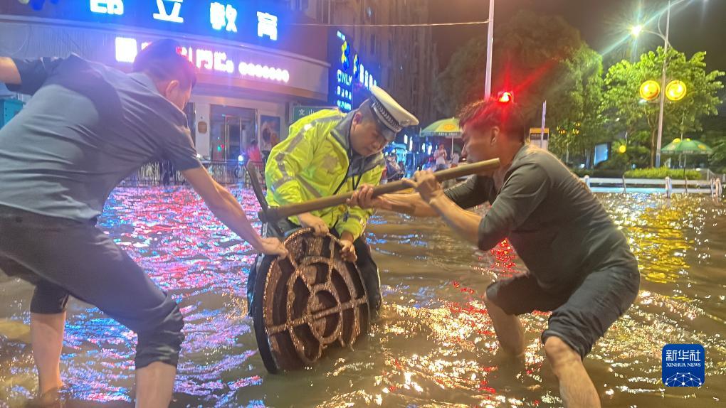 9月5日晚,因路面積水嚴(yán)重,福州市連江縣公安局民警與群眾抬起井蓋,疏通下水道。