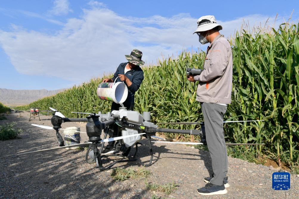 9月5日,在山丹縣位奇鎮(zhèn)十里堡村,技術(shù)人員開展“一噴多促”準備工作。