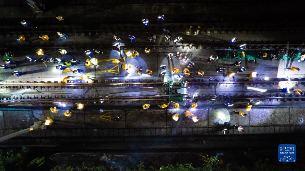 9月6日凌晨,鐵路工人在京廣高鐵株洲西至衡山西區間進行換軌施工(無人機照片)。