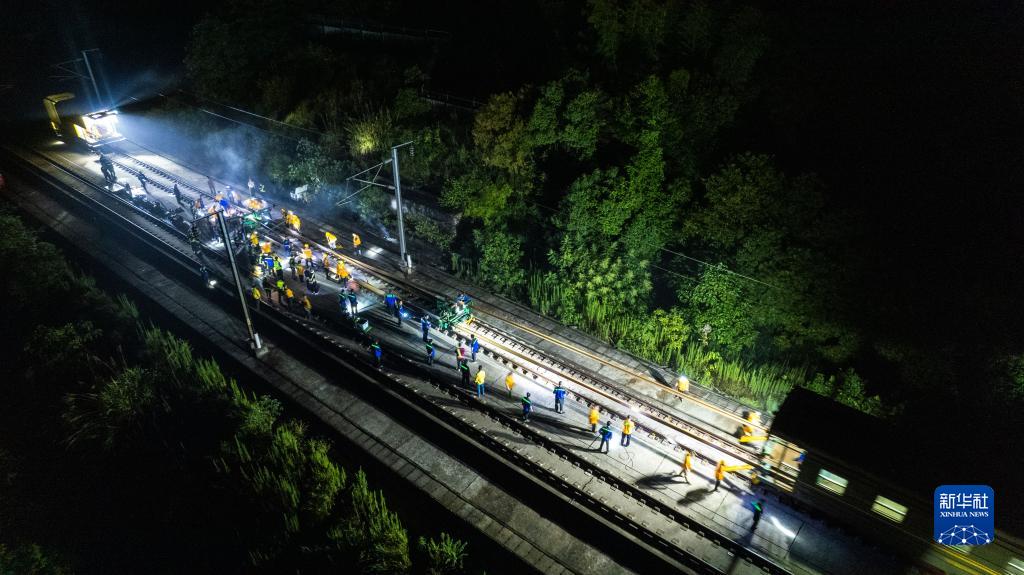 9月6日凌晨,鐵路工人在京廣高鐵株洲西至衡山西區間進行換軌施工(無人機照片)。