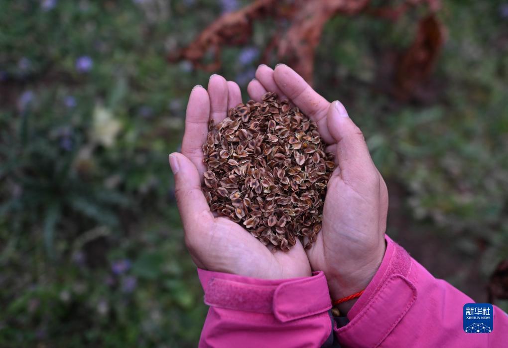 9月5日,中國科學院西北高原生物研究所副研究員楊路存在果洛藏族自治州甘德縣崗龍鄉一處“草藥間種”的黑土灘治理試驗田展示當地道地藥材唐古特大黃的種子。