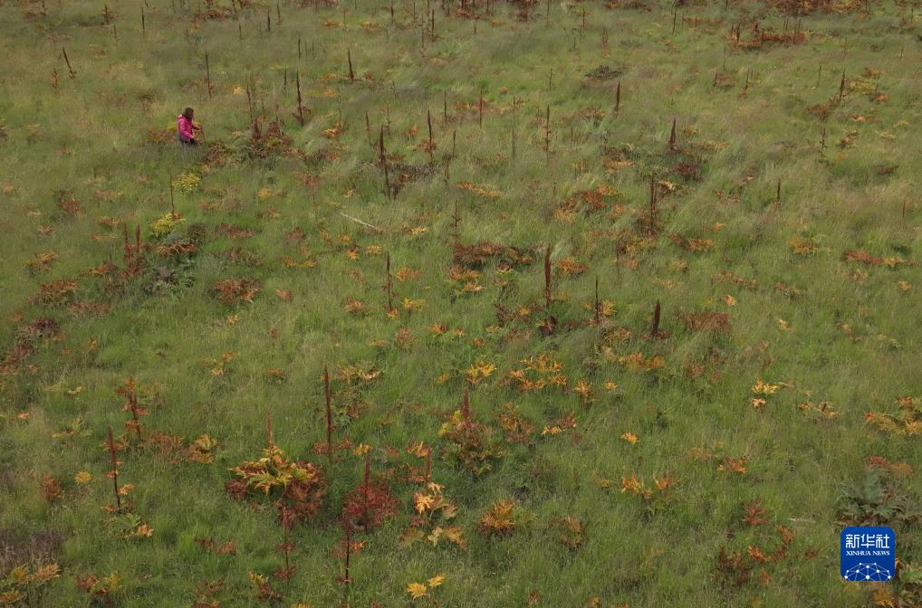 9月5日,中國科學院西北高原生物研究所副研究員楊路存在果洛藏族自治州甘德縣崗龍鄉一處“草藥間種”的黑土灘治理試驗田中查看植被生長情況(無人機照片)。