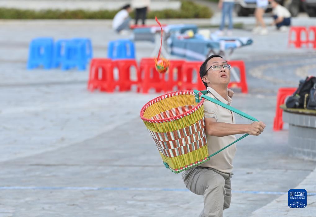 9月5日,在梧州市蒼梧縣六堡鎮山坪村同心廣場,選手在拋繡球比賽中。
