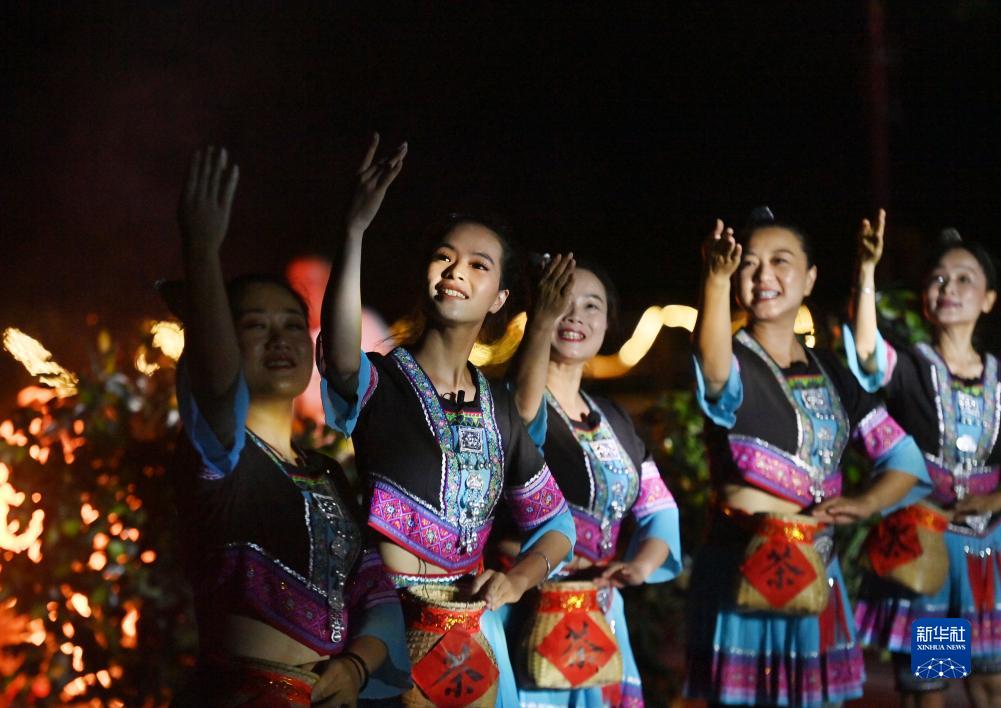 9月5日,在梧州市蒼梧縣六堡鎮山坪村同心廣場,村民在篝火晚會上跳采茶舞。