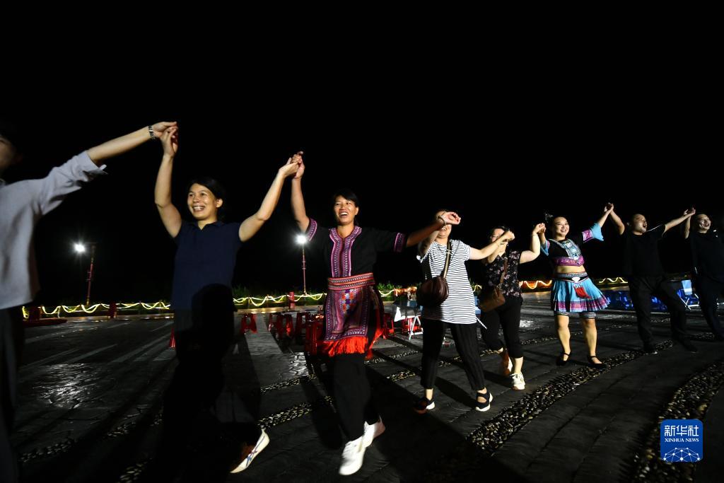 9月5日,在梧州市蒼梧縣六堡鎮山坪村同心廣場,各族干部群眾在篝火晚會上跳“民族團結舞”。