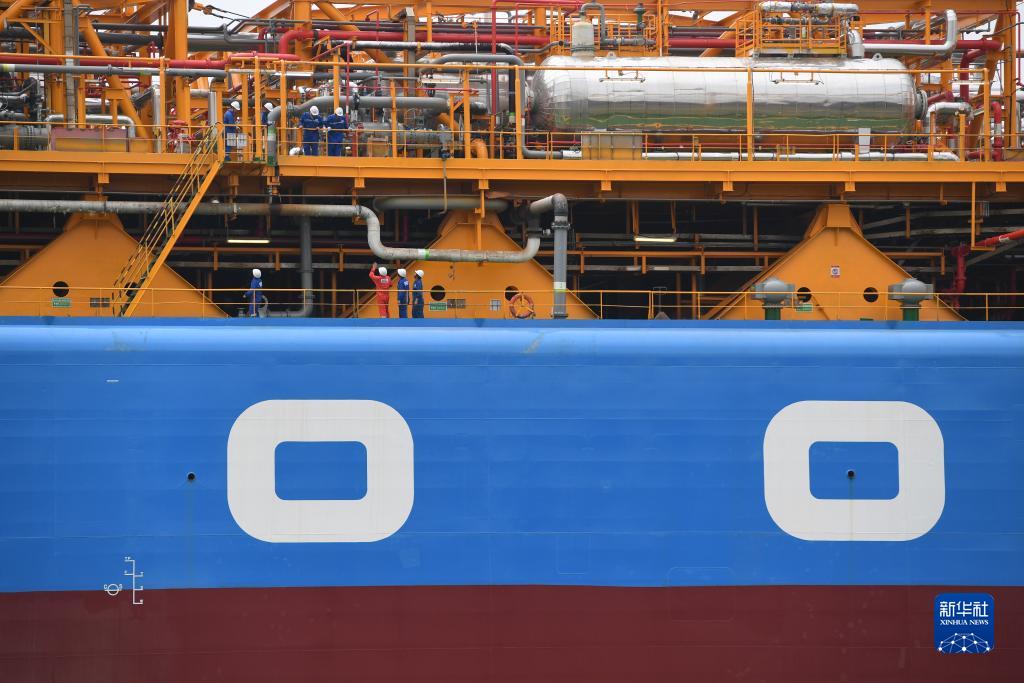 9月6日,在深圳孖洲島的友聯船廠,工作人員在“南海奮進”FPSO出發前檢查設施設備情況。