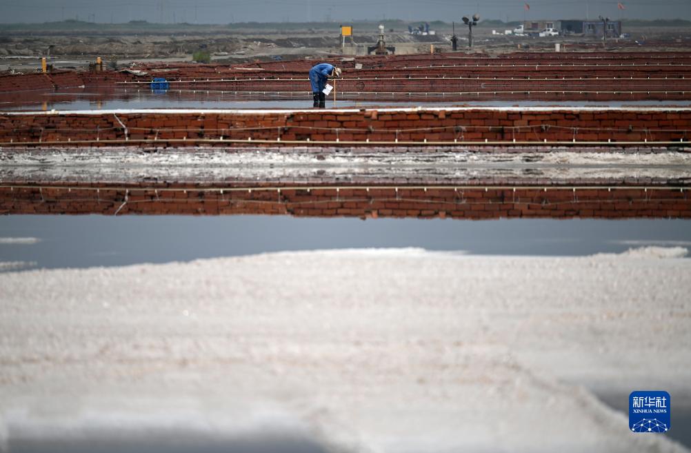 9月6日,在天津長蘆漢沽鹽場,工人在鹽池中測量鹵水深度。