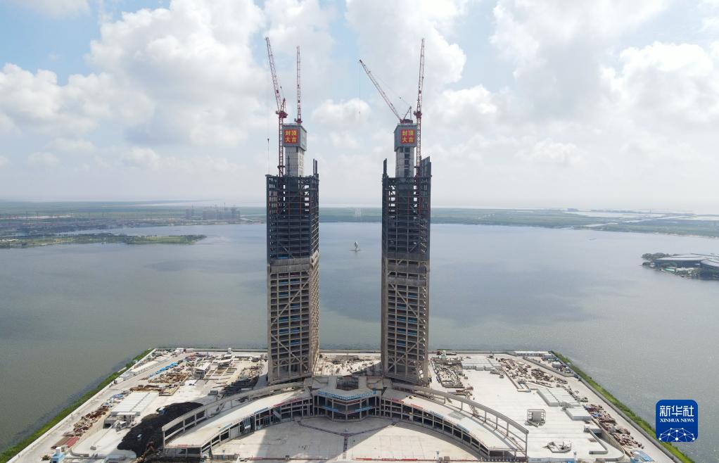 9月6日拍攝的臨港西島中銀金融中心項目建設工地(無人機照片)。