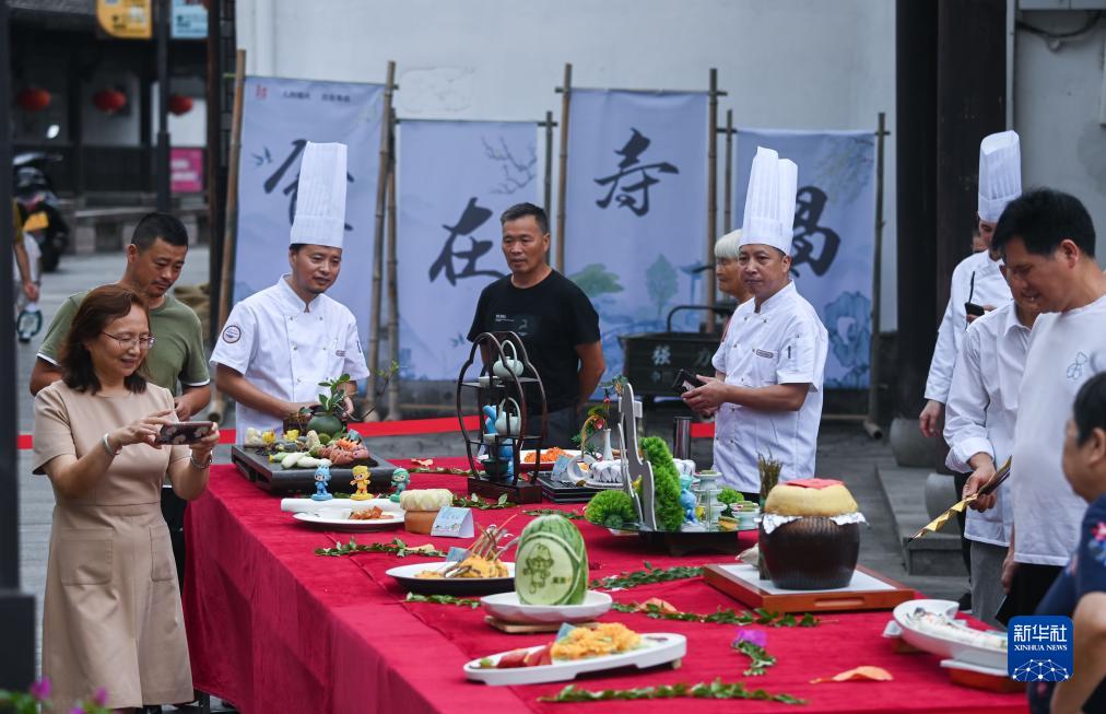 9月6日,在浙江省建德市壽昌古鎮(zhèn)開幕的古鎮(zhèn)好吃節(jié)上,由建德市餐飲協(xié)會(huì)制作的“魚躍亞運(yùn)”“騰龍飛天”“亞運(yùn)定勝”“金牌滿堂”等多道亞運(yùn)主題菜品在現(xiàn)場(chǎng)展示,吸引了眾多市民的眼球。