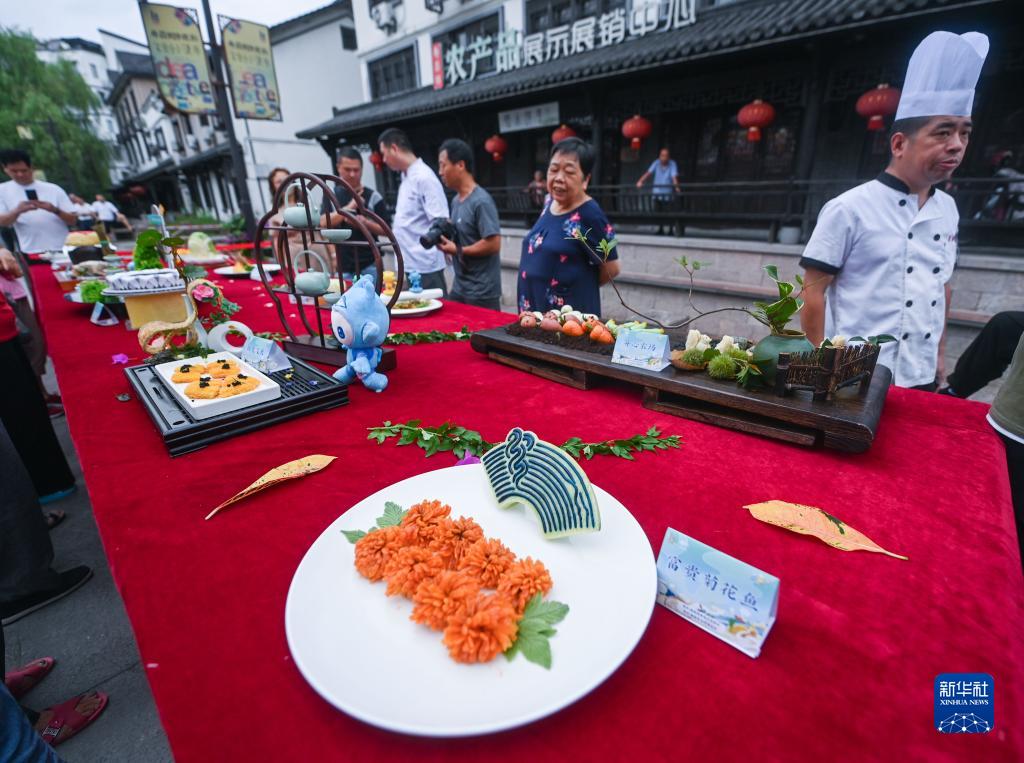 9月6日,在浙江省建德市壽昌古鎮開幕的古鎮好吃節上,由建德市餐飲協會制作的“魚躍亞運”“騰龍飛天”“亞運定勝”“金牌滿堂”等多道亞運主題菜品在現場展示,吸引了眾多市民的眼球。