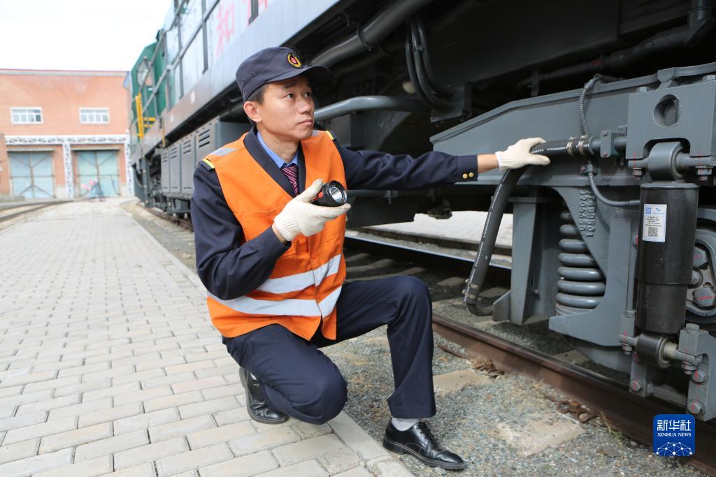 9月6日,在齊齊哈爾機(jī)務(wù)段滿洲里運(yùn)用車間,中歐班列出境司機(jī)進(jìn)行發(fā)車前的檢查。
