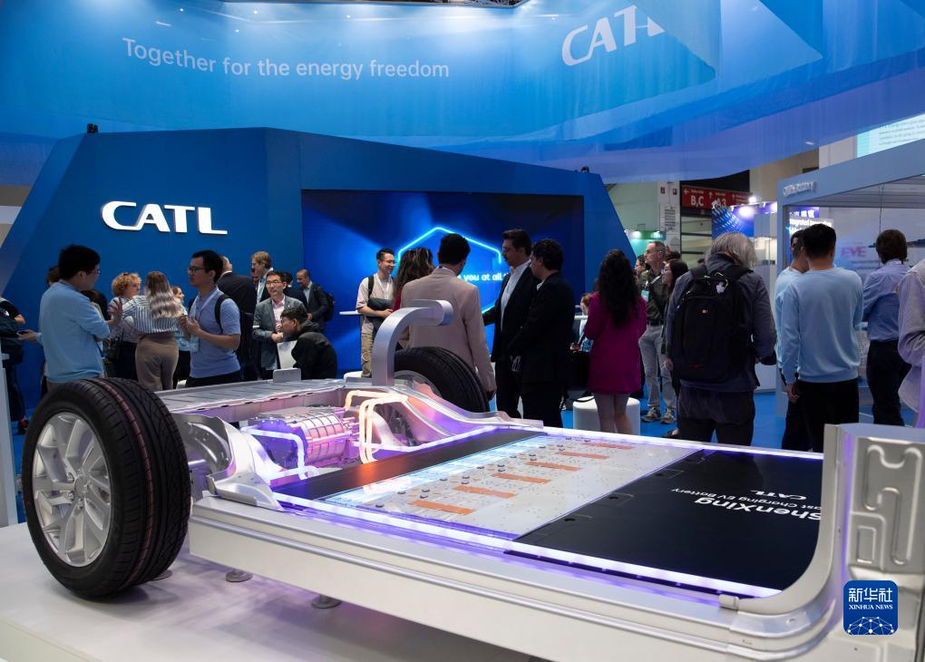 這是9月5日在德國慕尼黑國際車展的寧德時代展區拍攝的神行超充電池展品。