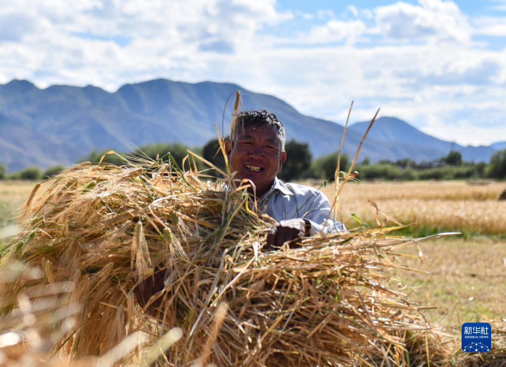 西藏日喀則市年楚河流域是西藏糧食的主產區之一,今年雨水豐沛,糧食長勢喜人,大地鋪金,農民喜迎豐收。新華社記者 晉美多吉 攝