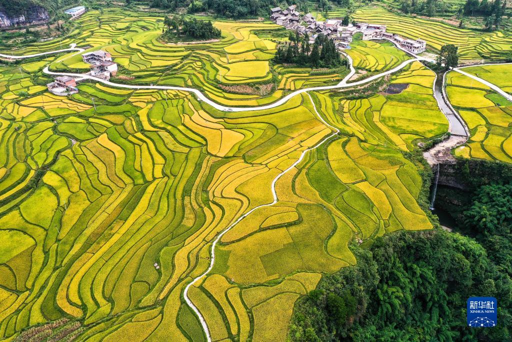 白露將至,貴州省黔南布依族苗族自治州貴定縣沿山鎮臘利梯田里的水稻逐漸成熟,呈現出一幅豐收在望的秋日畫卷。