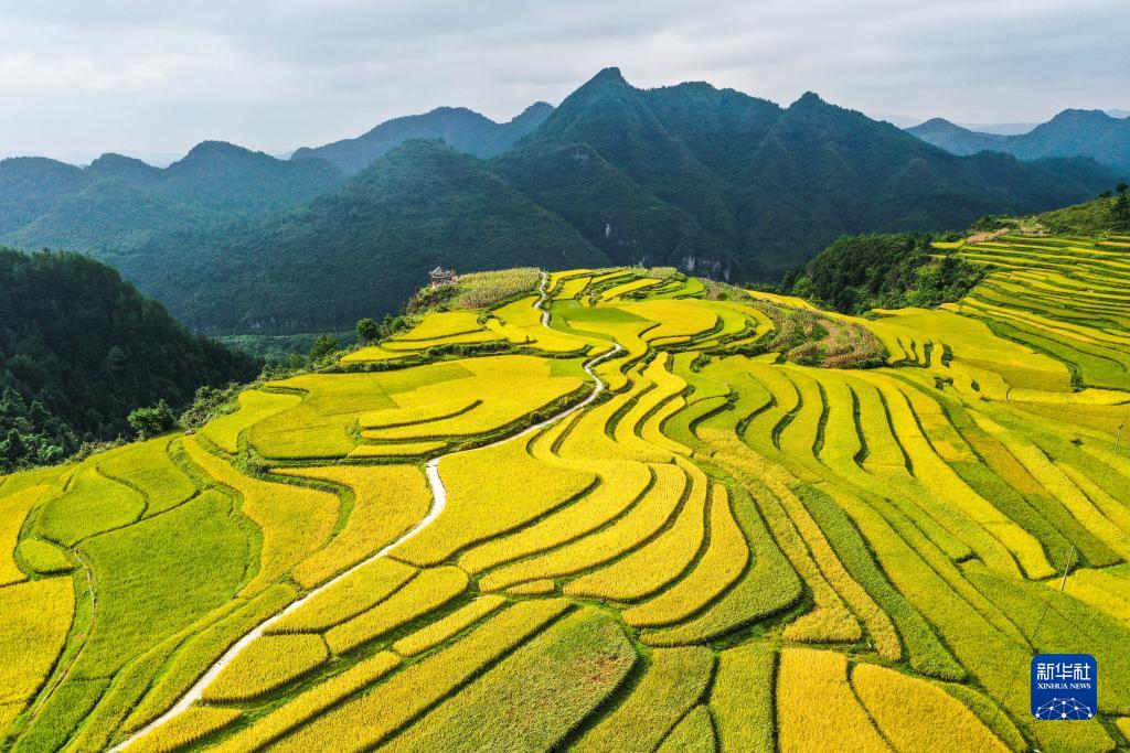 白露將至,貴州省黔南布依族苗族自治州貴定縣沿山鎮(zhèn)臘利梯田里的水稻逐漸成熟,呈現(xiàn)出一幅豐收在望的秋日畫卷。