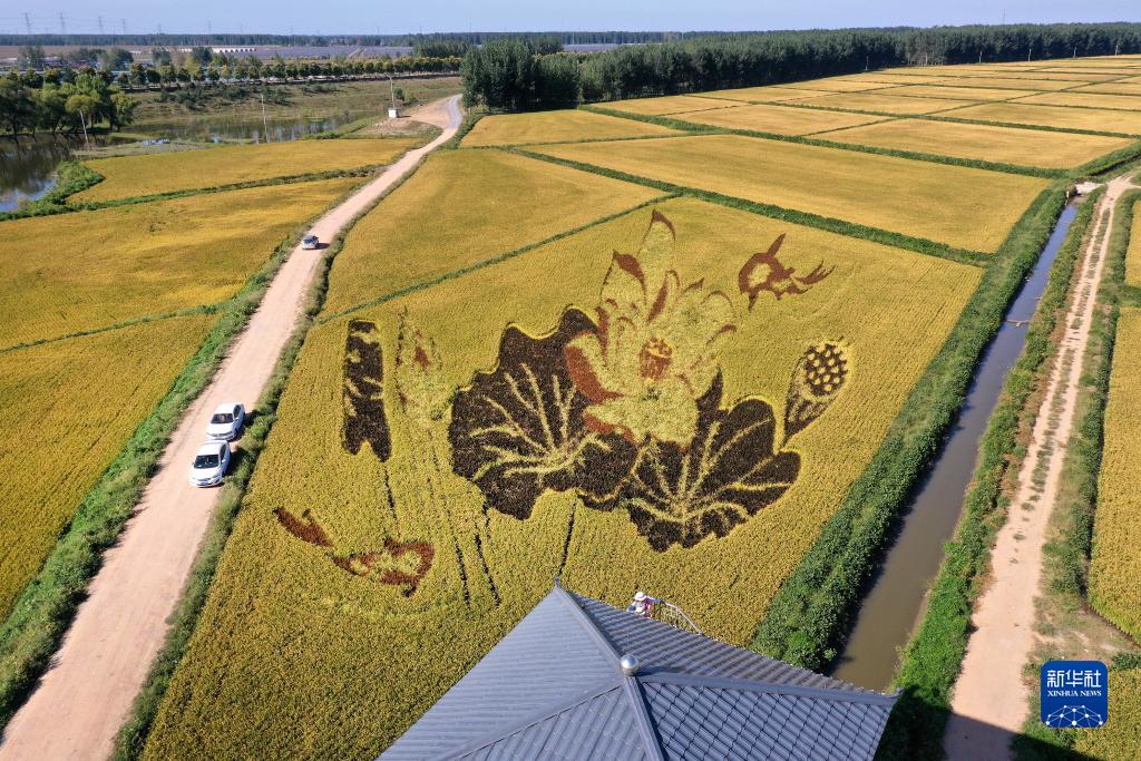 初秋時節,遼寧省鞍山市臺安縣遼河文化旅游景區的稻田畫吸引不少游客前來參觀游覽。由多種顏色組成的巨型稻田畫勾勒出豐收壯美景象。