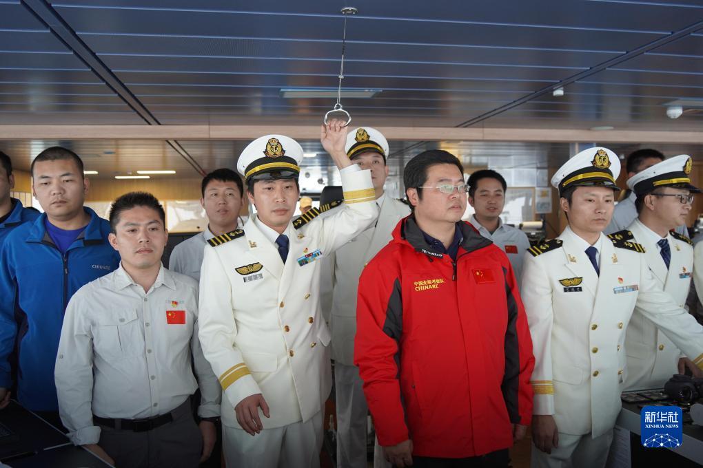 這是抵達北極點瞬間,“雪龍2”號極地科考破冰船船長肖志民拉響汽笛(9月5日攝)。