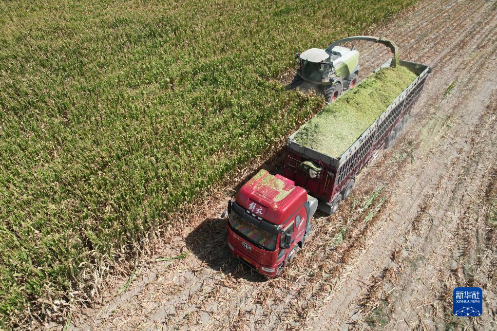 9月6日,在金昌市永昌縣六壩鎮八壩村,工作人員使用大型機械收獲青貯玉米(無人機照片)。