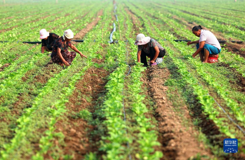9月7日,在河北省石家莊晉州市東里莊鎮仁義村的千畝白菜種植基地,農戶對白菜秧苗進行除草疏苗作業。