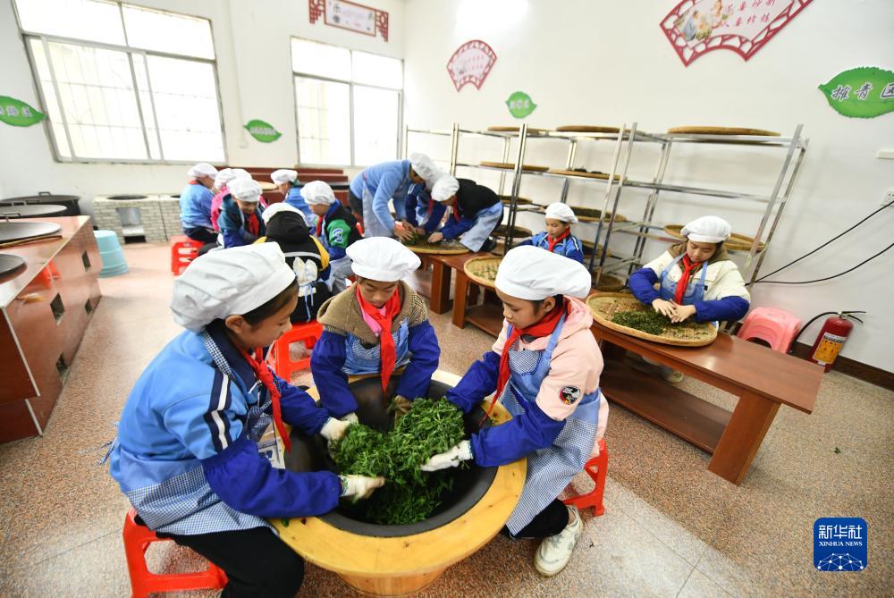 在梧州市蒼梧縣六堡鎮中心校,小學生們在學習制茶(3月29日攝)。