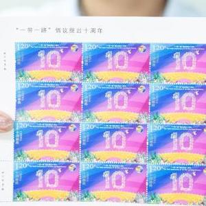 9月7日,中國郵政發行《“一帶一路”倡議提出十周年》紀念郵票一套1枚,郵票圖案以花卉、和平鴿,以及代表基礎設施合作和互聯互通概念的公鐵運輸車輛、貨輪、起重機等元素共同組成的數字“10”為主體,并結合“絲路金橋”元素。郵票由北京郵票廠有限公司影寫工藝印制,另與香港郵政、澳門郵電共同印制同題材小本票1本。全套郵票面值1.20元,計劃發行數量705萬套。