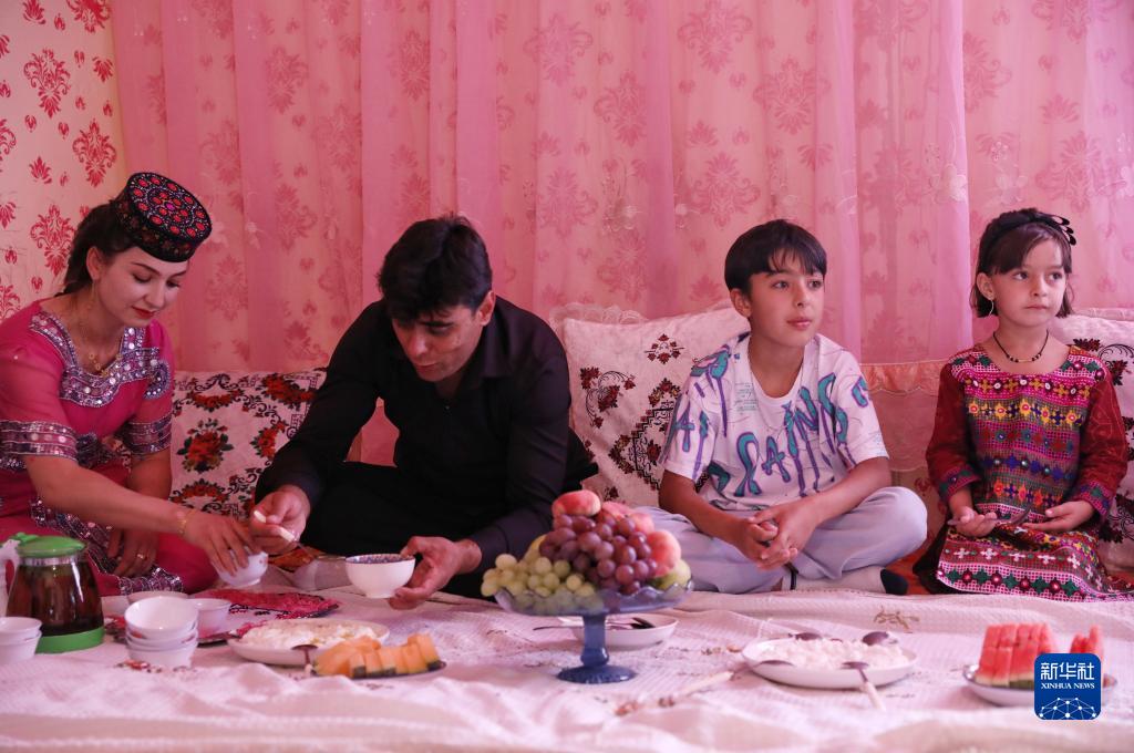 拜合提亞爾·居馬汗(左二)和家人在家中吃晚飯(9月4日攝)。