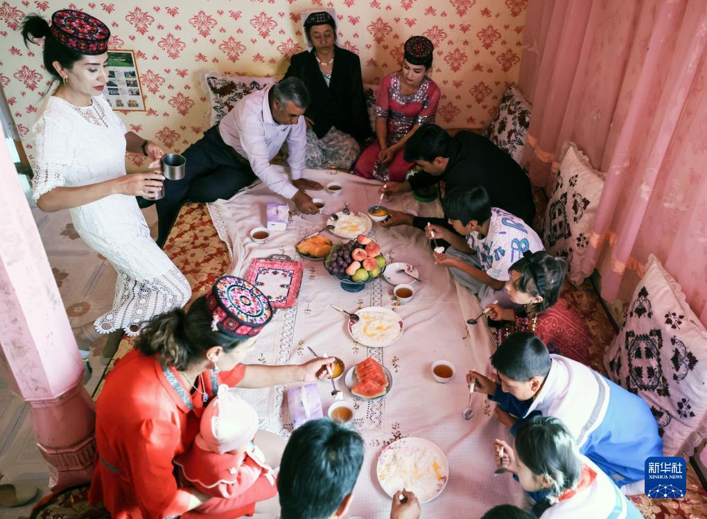 拜合提亞爾·居馬汗一大家人在家中吃晚飯(9月4日攝)。