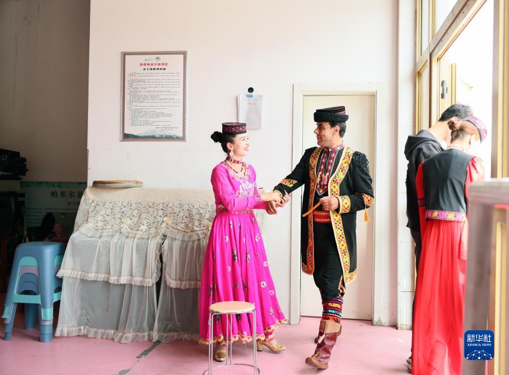 迎賓演出在即,拜合提亞爾·居馬汗(左二)和妻子在排練室準備(9月4日攝)。