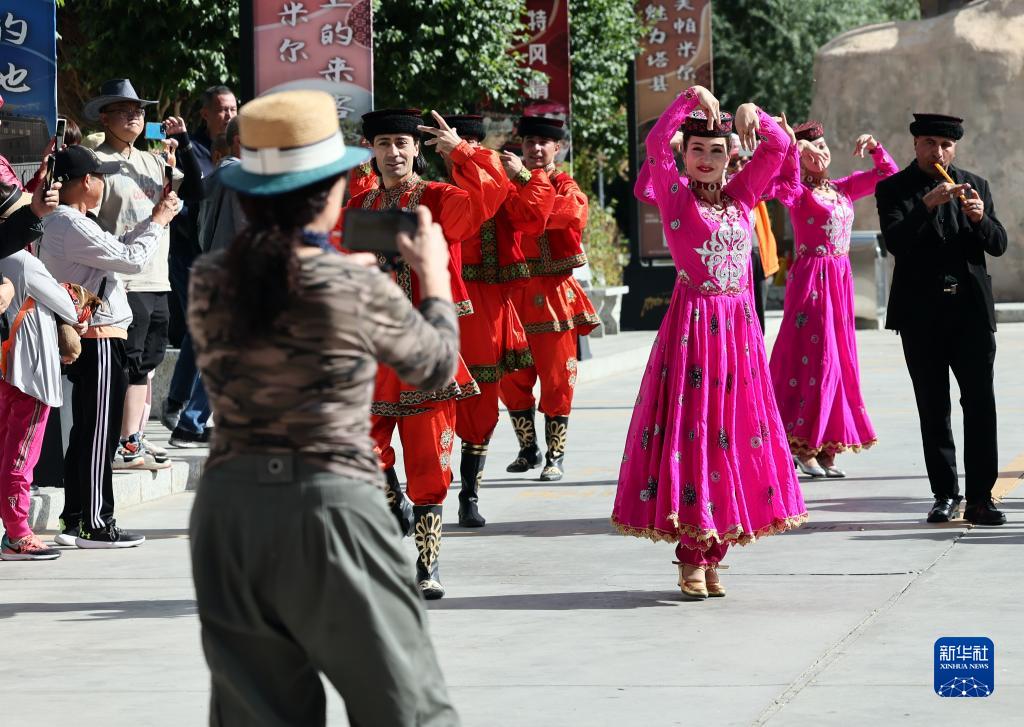 古麗巴努爾·庫爾恰克和同事們一起為遠道而來的游客起舞,展示當地特色迎賓儀式(9月4日攝)。