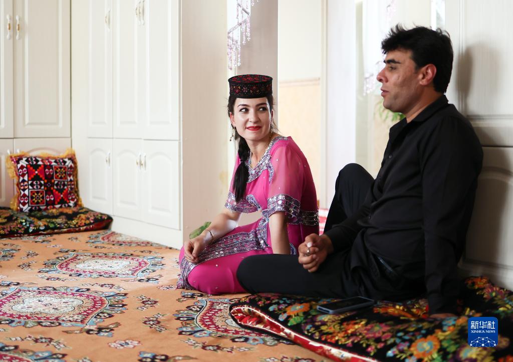 在位于縣城的新家中,古麗巴努爾·庫爾恰克深情地望向丈夫(9月4日攝)。