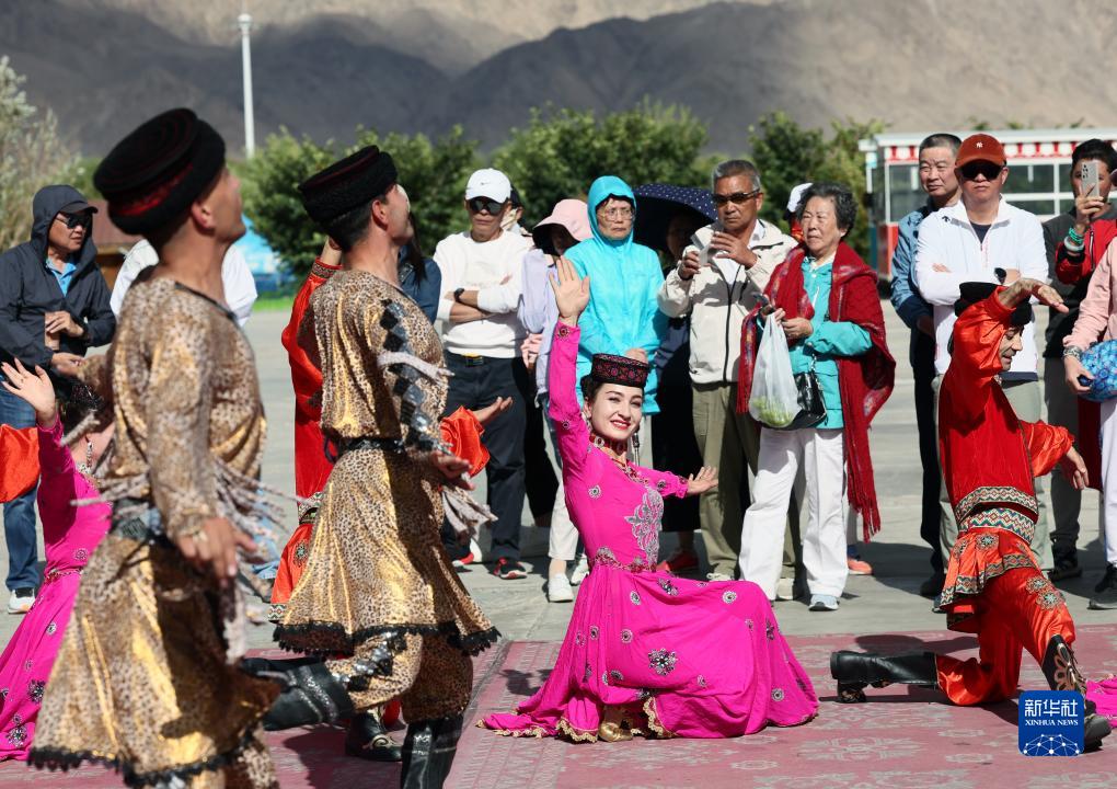 古麗巴努爾·庫(kù)爾恰克和同事們一起為遠(yuǎn)道而來(lái)的游客表演鷹舞(9月4日攝)。