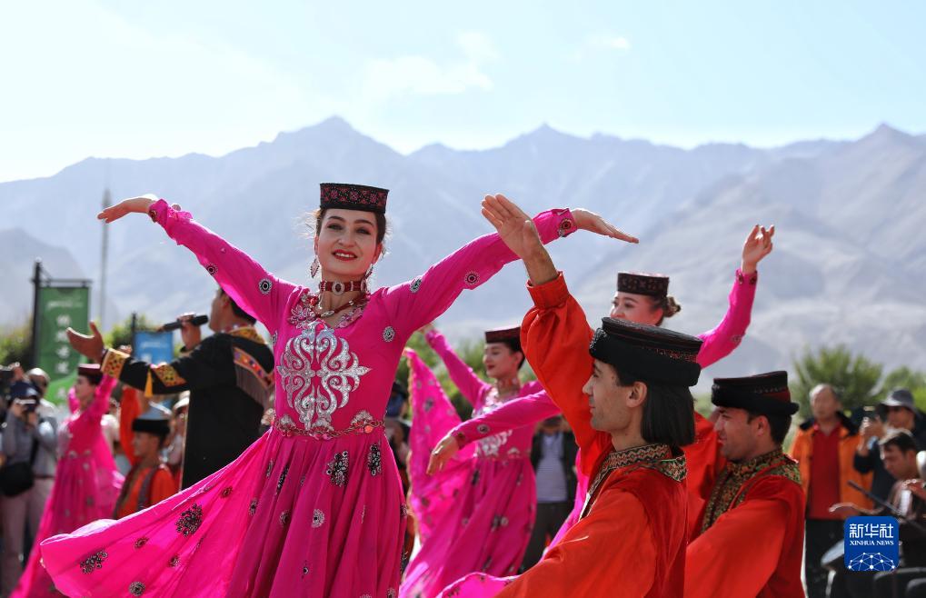 古麗巴努爾·庫爾恰克和同事們一起為遠道而來的游客起舞,展示當地特色迎賓儀式(9月4日攝)。