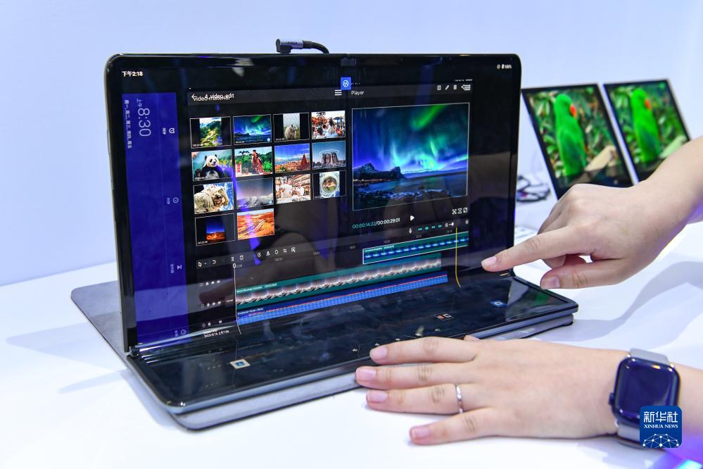 9月7日,在“2023世界顯示產業(yè)大會新型顯示創(chuàng)新成果展”現場,工作人員在展示京東方17.3"X-Fold十字折疊OLED。