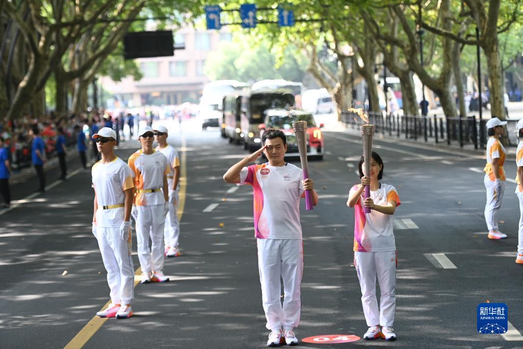 9月8日,火炬手徐川子(右)與鐘毅在火炬?zhèn)鬟f中。