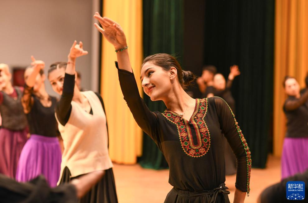 新疆塔縣文工團舞蹈演員尼亞孜比給木·米路(右)和同伴們排練舞蹈節目《塔吉克婚禮》(9月7日攝)。新華社記者 胡虎虎 攝