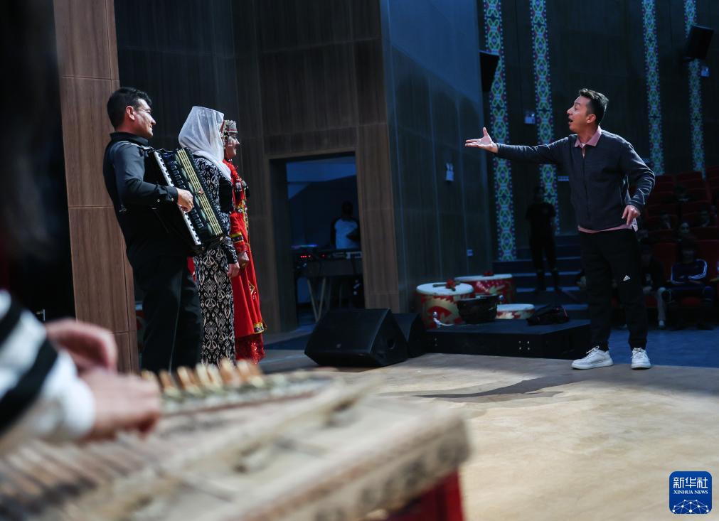 新疆藝術(shù)劇院歌舞團(tuán)再比江·阿地力(右)導(dǎo)演在塔縣文化服務(wù)中心劇場(chǎng)指揮演員排練(9月4日攝)。新華社記者 蘭紅光 攝