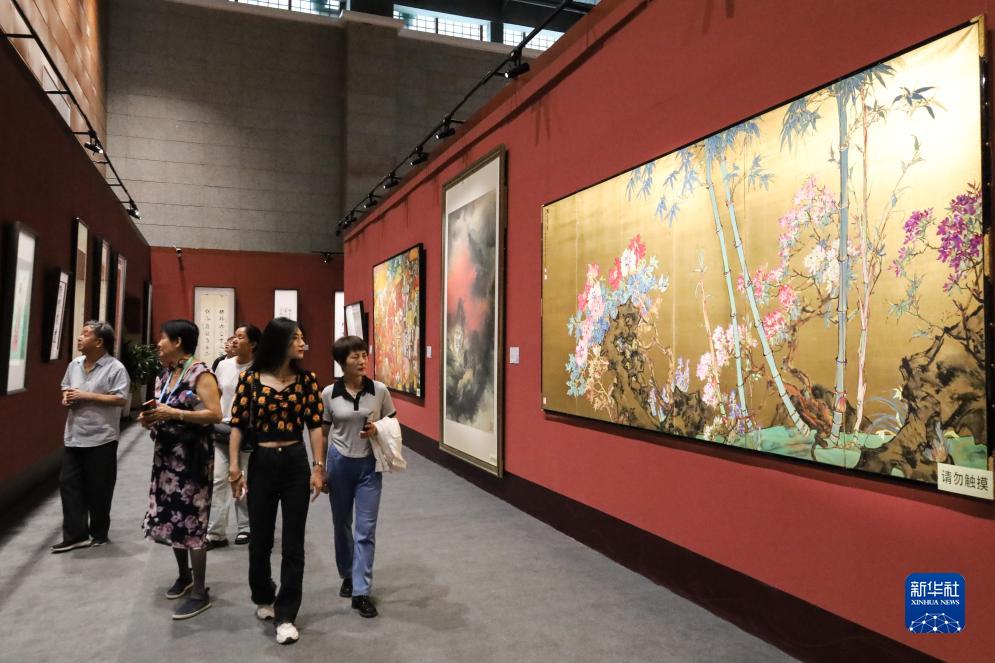 9月7日,觀眾在第六屆絲綢之路(敦煌)國(guó)際文化博覽會(huì)上參觀絲綢之路繪畫藝術(shù)精品展。