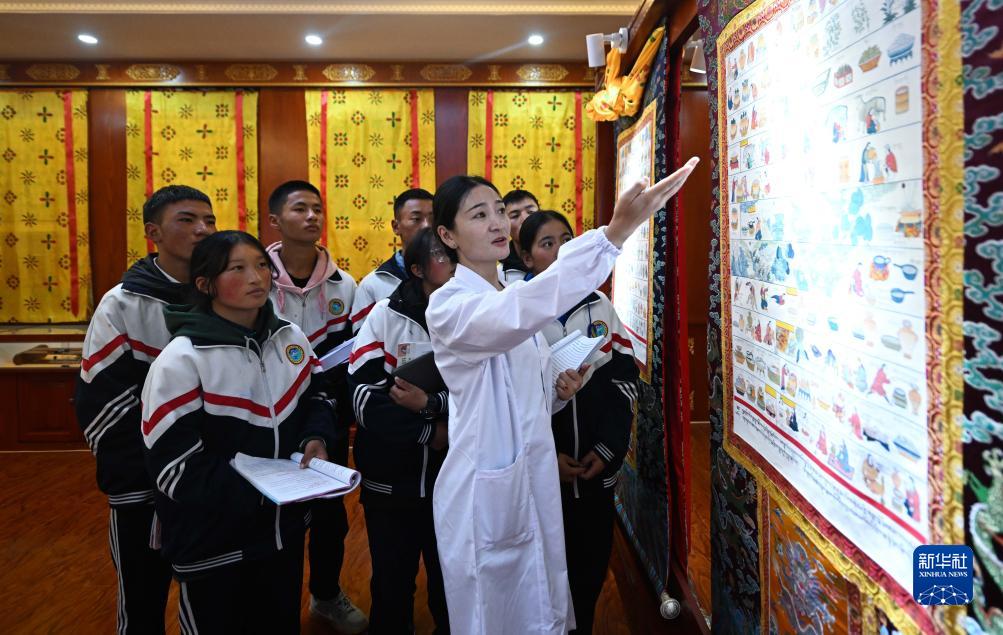 9月8日,在果洛藏族自治州職業(yè)技術(shù)學校,藏醫(yī)醫(yī)療與藏藥專業(yè)學生跟隨授課老師觀看藏醫(yī)典籍唐卡。