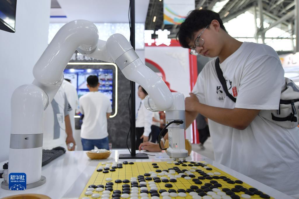 9月6日,參觀者在數博會上與5G智能機器人下圍棋。