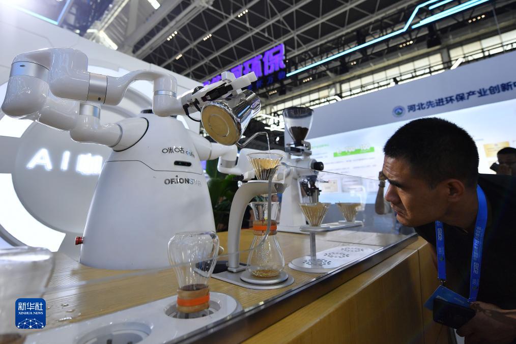 9月6日,參觀者在數(shù)博會(huì)上觀看AI咖啡手沖機(jī)器人制作咖啡。