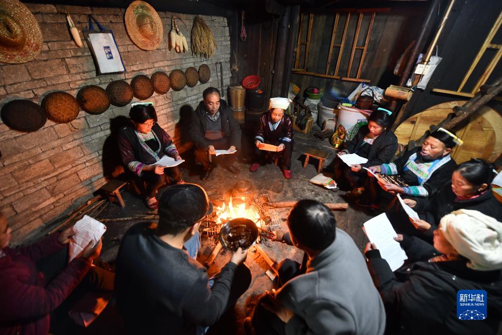 潘先鋒(后排左二)在火塘邊給烏英苗寨夜校的婦女們上課(2021年11月9日攝)。