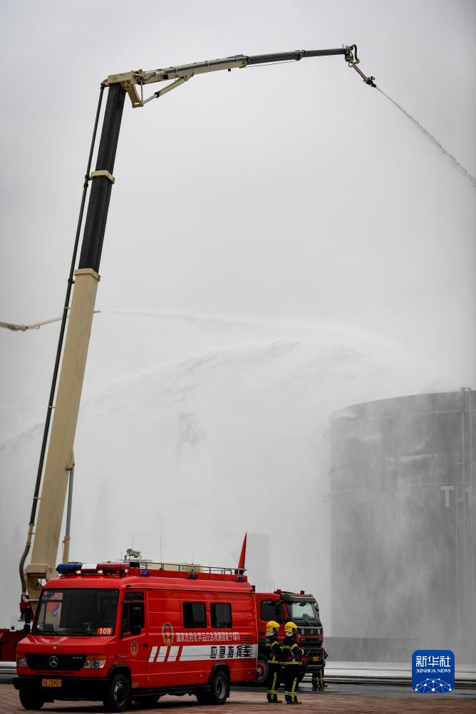 9月8日,在實(shí)戰(zhàn)滅火演練現(xiàn)場,大跨度高噴消防車對甲醇儲罐進(jìn)行冷卻滅火。