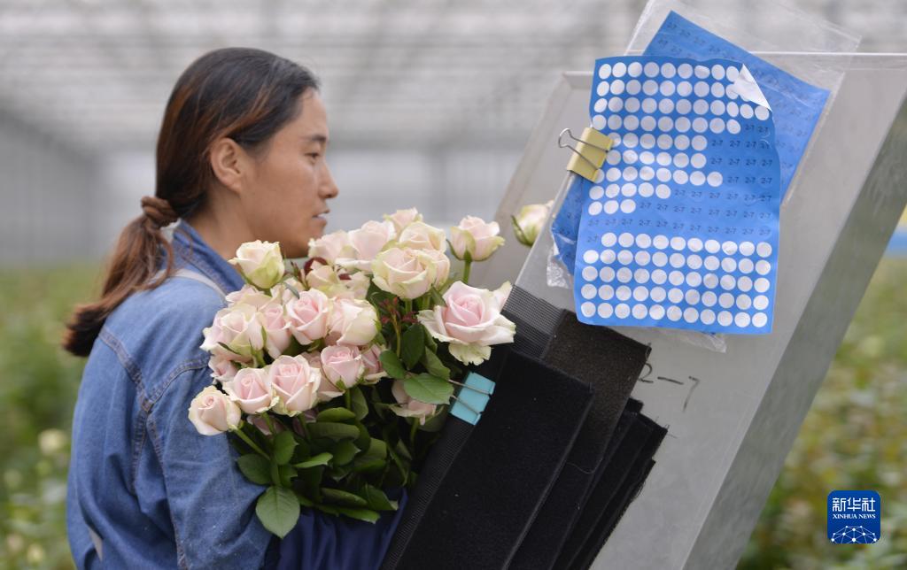 9月7日,在臨夏市枹罕鎮的一處花卉特色產業示范園區智能溫室,工人把采摘的玫瑰打包。