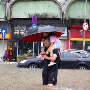 9月8日,在廣州市番禺區(qū)繁華路,外賣騎手涉水行進(jìn)。